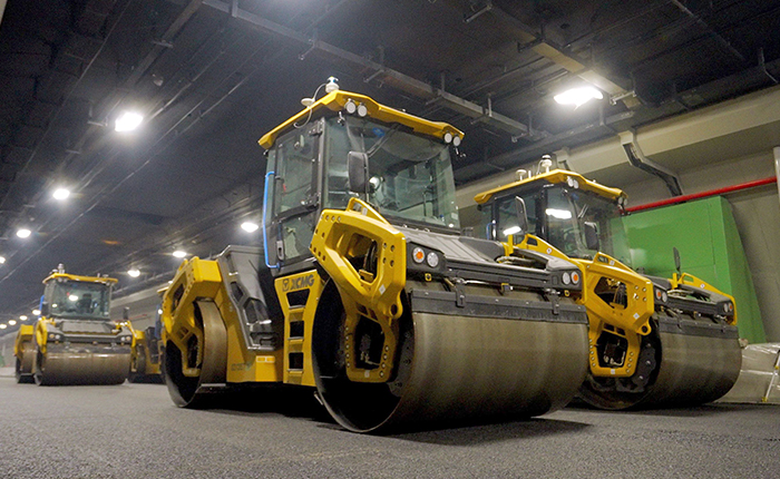 全线由徐工摊铺机RP1005、RP805IV进行双机联铺,摊铺宽度9-11 在线影视,5m、沥青上面层摊铺厚度100px,并由XD135TIV双钢轮压路机进行压实,在狭窄的作业空间内展现出强大的施工能力。。